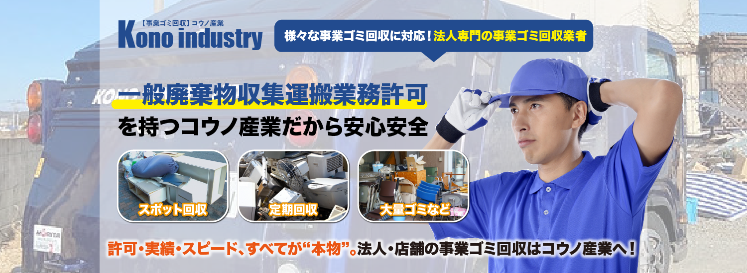 コウノ産業は、一般廃棄物収集運搬業の許可を持つ地域密着企業として、飲食店・事務所・小売店・集合住宅など幅広い業種に対応。