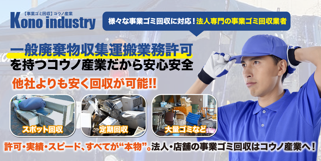事業ゴミ回収業者の中でも、正式な「一般廃棄物収集運搬業許可」を持つ業者は限られています。コウノ産業は行政から認可を受けた正規の許可業者として、オフィス・店舗・施設など法人様の廃棄物を法令遵守で安全に回収・処理しています。違法業者によるトラブルや不法投棄の心配がなく、安心してお任せいただけます。 |